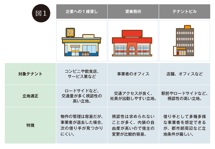 建物は、1社の企業に貸し出すことを前提とした店舗タイプの1棟貸しから、駅前などで需要のあるテナントビルまで様々です(図1)。1棟貸しの場合、借主が中途撤退や契約満了した後、次の借り手が見つかりにくいことがあります。前の借主の事業に合わせた建物になっているため、借り手が限られるからです。このリスクを避けるために、撤退時に次の借り手を紹介することを契約条項に盛り込んでいる不動産会社もあります。