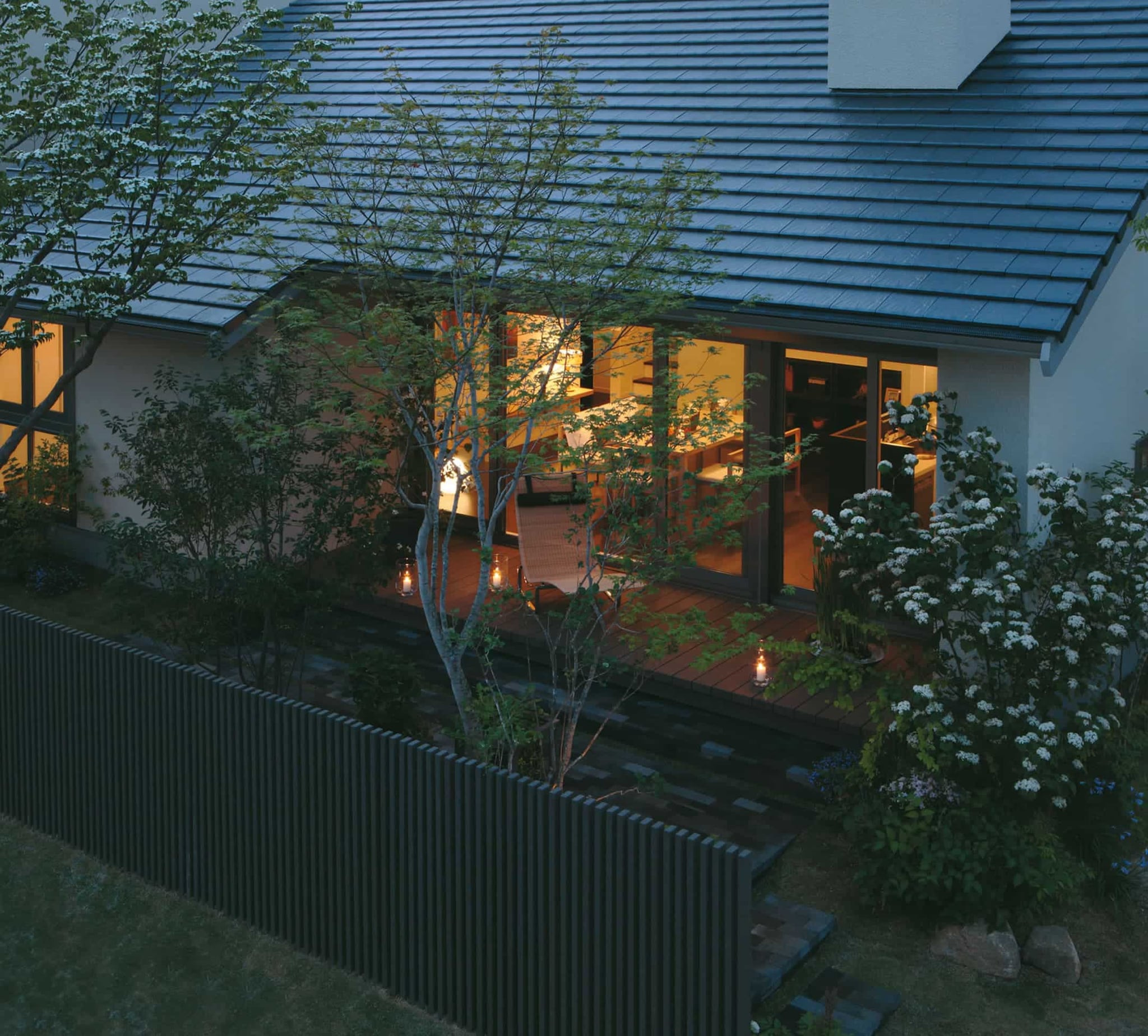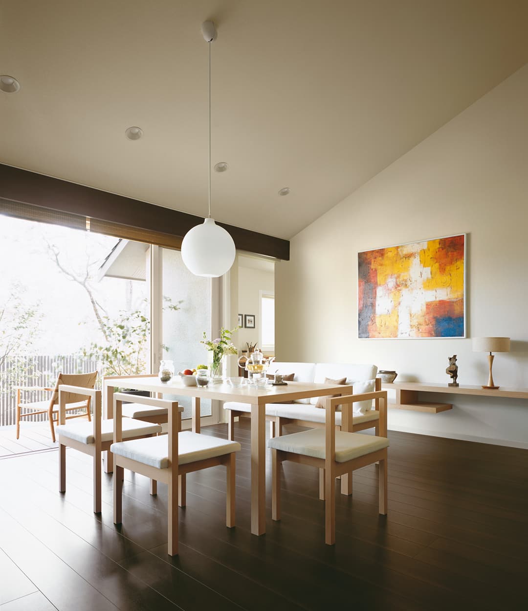 深い軒の出と 5.4 m幅の大開口は、庭とリビングをゆるやか