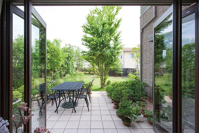 リビングから見える鮮やかな緑。テラスが張り出し、庭と室内をほどよくつないでいる。
