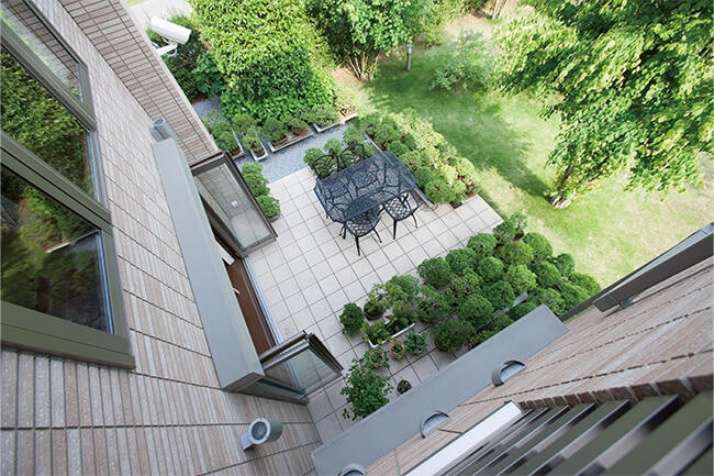 2階から見た庭。1階のテラスに置かれた盆栽が、庭に軽快な表情を与えている。