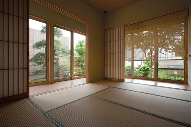 和室に面した日本庭園。縁側越しに見える風景はどこか懐かしい。