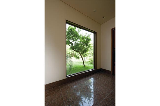 この広大な庭は、1階のリビングやダイニングはもちろん、2階の居室やテラスからも存分に眺めることができる。また、エントランスの庭に面した窓からは、1本の紅葉がまるで絵画のように映り込む仕掛けになっている。Oさま邸にとっては、庭の緑がまさに住まいに欠かせない存在であることがわかる。