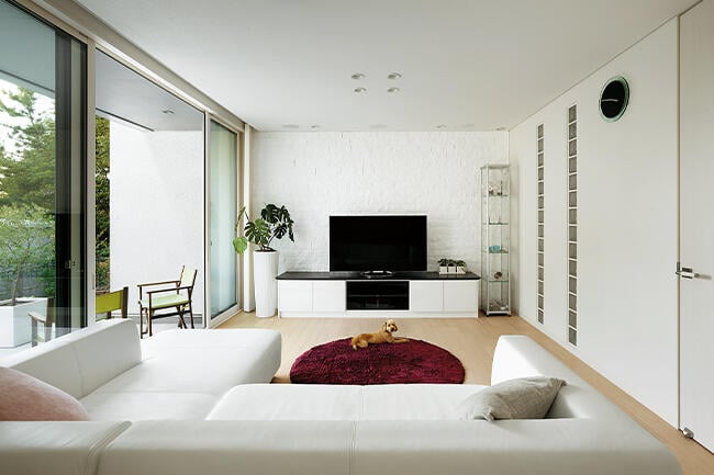 「白」ですっきりと統一されたLDKは、ご夫妻と愛犬の憩いの場。リビングとダイニングの間に設けた吹き抜けの高い窓から光が差し込み、住空間を明るく包みます。