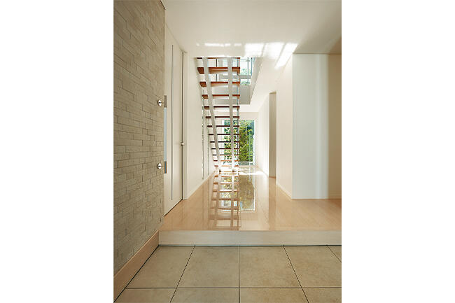 緑豊かな山を背にしてゆったりと気品高くたたずむ白亜のSさま邸。玄関ドアを開けると、ホール正面のガラス壁を通して坪庭や雑木林に視線が抜け、リビングに入ればワイドなサッシから視界いっぱいに大きな芝生の庭園が広がります。