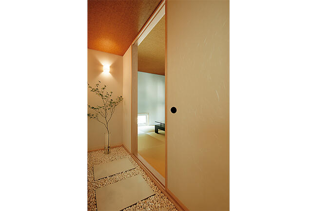 一方、和室は趣向を凝らし、玉砂利の前室を設けて旅館のようなしつらえに。バスコートを設けたリゾートスパさながらの浴室もご夫妻のお気に入り。雑木林の息吹を感じながら露天感覚で入浴できます。