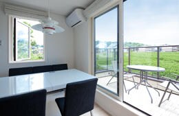 さらにダイニングには、白と黒のコントラストが印象的なモダンな家具が置かれ、座ったときには窓から富士山が間近に見えるという贅沢さ。ダイニングからはテラスも張り出しており、富士山の絶景を眺めながらのランチを楽しんでいるとのことでした。