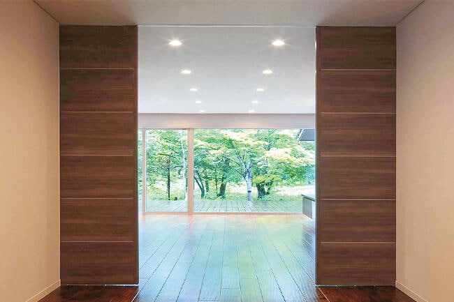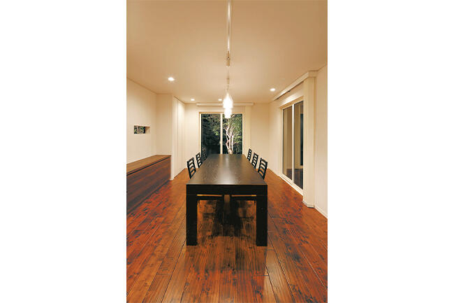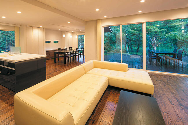 また軽井沢という立地もあり、周囲の自然との一体感もご希望でした。そこで、パブリックスペースの床は、木の風合いを存分に活かしたなぐり調の床材で統一。しかもリビングとテラスの床材が同じ幅となっているため、空間がのびやかに広がり、大きな開口部から眺める自然とも見事に調和しています。