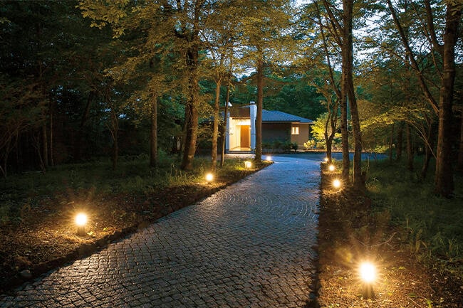 森をくぐり、風情たっぷりの長い石畳を歩いて行くと、特徴のある外観が見えてきます。風除室とエントランスは縦の直線を活かしたシャープな印象で、2枚の壁で山小屋を切り開いたかのよう。この独特の外観が存在感を放っています。