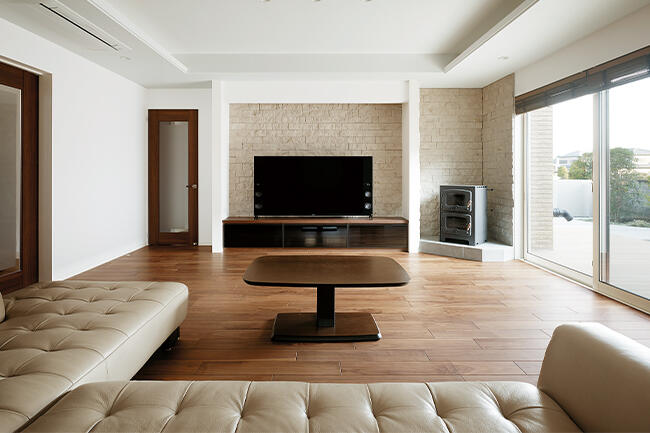 薪ストーブがあるリビングで、揺らめく炎を眺めながら語り合うご家族団らんのひととき。FF式薪ストーブのオーブンからは、家庭菜園で採れた野菜を載せたピザの香ばしい匂いが...。そんな暖かな光景が浮かんでくるKさま邸。
