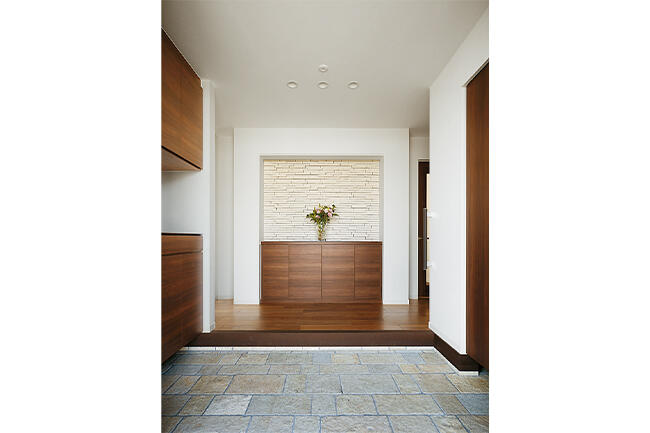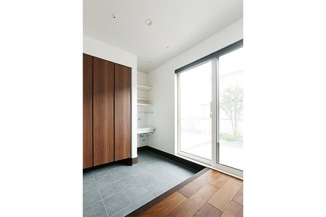 家事がしやすい工夫も見逃せません。洗濯機のある脱衣室と室内干しができる土間のサンルームが玄関ホールで一直線に結ばれているから移動がとてもスムーズ。サンルームに設置した深いシンクで、家庭菜園で収穫した泥つき野菜も汚れを気にせず洗えます。