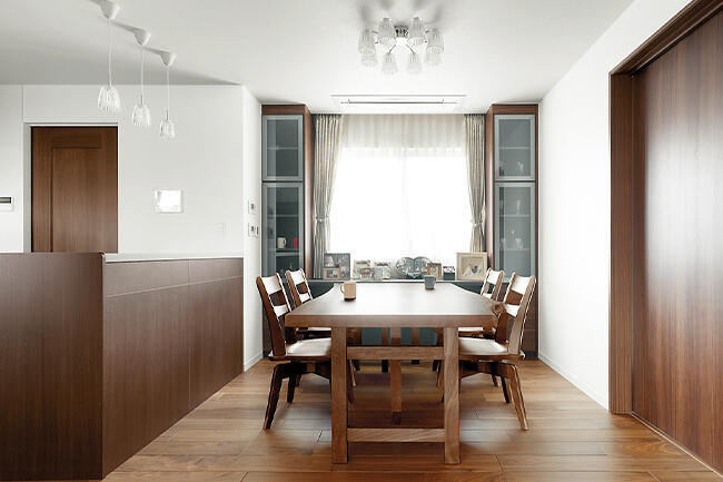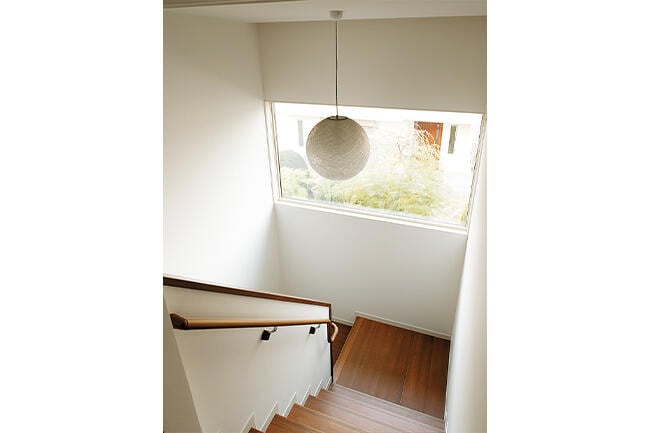 「扉を開けると北側の坪庭まで視線が抜けるのが心地よくて。南側の庭に面した掃き出し窓と坪庭の地窓を開ければ、風がすっと通り抜け、階段の天窓からも熱気を逃がせるので、暑い夏も爽やかに過ごせます。ダイニングキッチンなど来客時に見せたくないスペースは、間仕切り扉で瞬時に隠せるのも便利ですね」