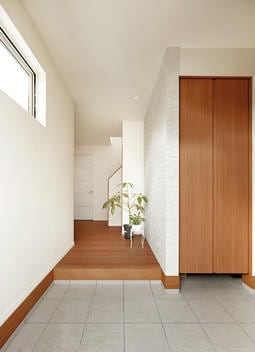 1階にご両親、妹さま、お祖母さま、2階にSさまご夫妻とお子さまの7人家族が暮らす二世帯住宅で、北側と南側にそれぞれの玄関を設けて独立感を出し、内部ドアで行き来できるようにしています。