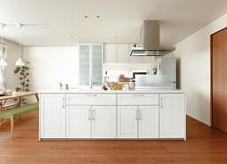 LDKはアイランドキッチンを中心に、ダイニングとリビングがL字につながる設計。南側のダイニングは日当たりが良く、東側のリビングからは大和三山が望めます。