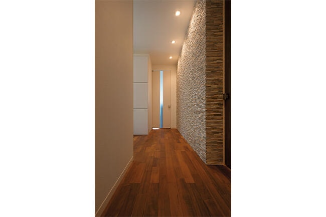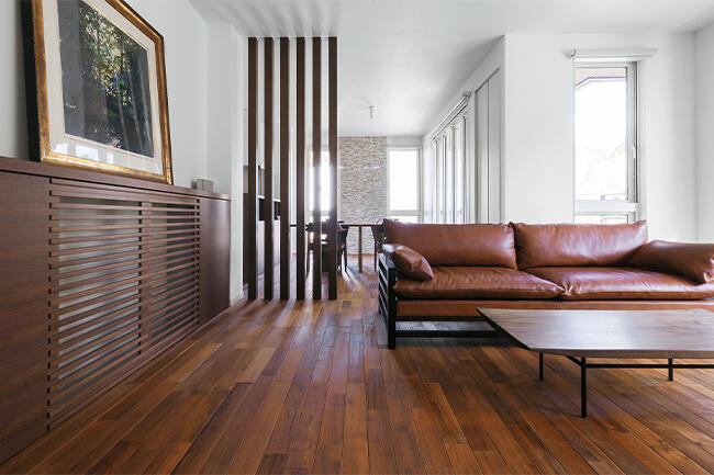 床は愛犬が走っても滑りにくい突板チーク材のフローリングに。落ち着いた色味と風合いがテレビボードや収納カウンターなど、こだわりの造作家具ともしっくりと調和し、木格子の仕切りや石張りの装飾壁がアクセントになって、上質な大人のくつろぎ感を醸し出しています。