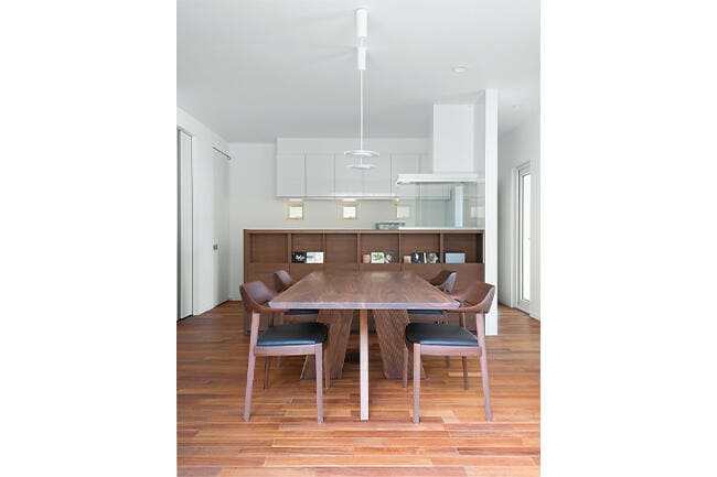 リビングとダイニングキッチンはオープンに続く間取りながら、前後にずらして設計されているため、どちらにいても二面の窓から光がたっぷりと差し込み、窓を開けると風が心地よく通り抜けます。