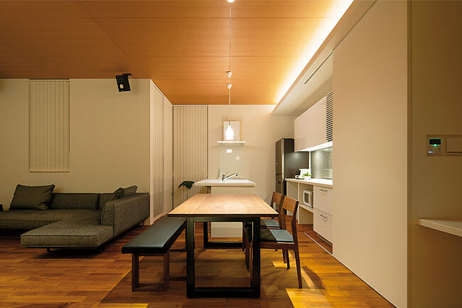 ダイニングキッチンは賑やかに会話をしながら食事が楽しめるよう、天井の間接照明とペンダントライトで明るく演出。リビングは一人でもゆっくりとくつろげるよう、テレビの上のダウンライトだけに絞り、落ち着きがありリラックスできる環境にしています。