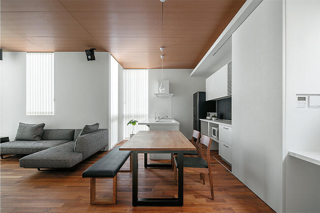 2m85㎝の天井高が伸びやかさを生むLDKは、板張りの天井とミャンマーチーク無垢材のフローリングが調和した木の温もり溢れる空間。くつろぎのリビングは、床から天井まであるフルハイトサッシの効果で、まるで庭とリビングがひと続きに繋がっているかのようです。