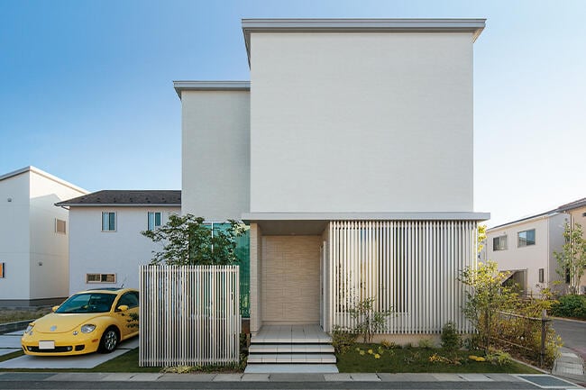 シンプルなスクエアを組み合わせた美しい外観が目を引くIさま邸。若いご夫婦のデザインイメージを叶えたお住まいは、空間にも素材にもこだわりが光ります。