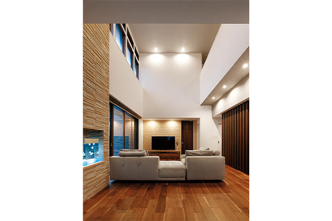 一方、LDKは白を基調にしたシンプルモダンな空間に。高さ6mのダイナミックな吹き抜けのリビングは、上の窓からも光が降り注ぎ、明るく爽やか。天井まで張り上げたタイル壁が、ホテルのラウンジのような気品を生み出しています。