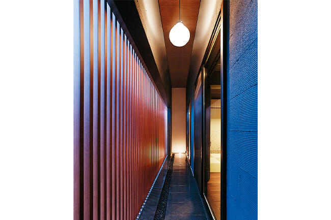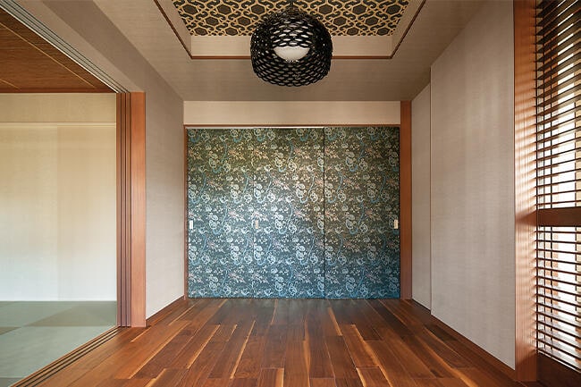 花鳥が描かれたアクセントクロスや、黒と金の亀甲柄クロスをあしらった折り上げ天井で、南蛮風のエキゾチックなインテリアに演出。部屋の外に細長く走らせた板石敷きの坪庭が木格子の壁としっくりと調和して、雅な趣を醸し出しています。