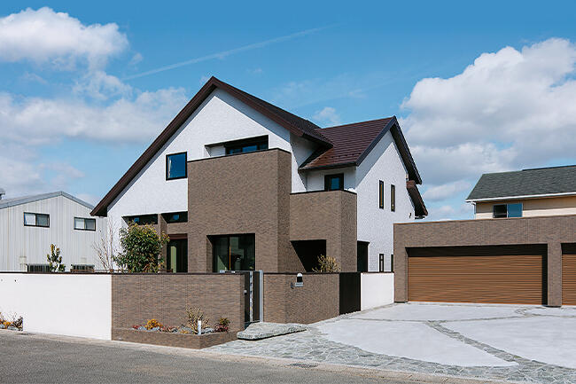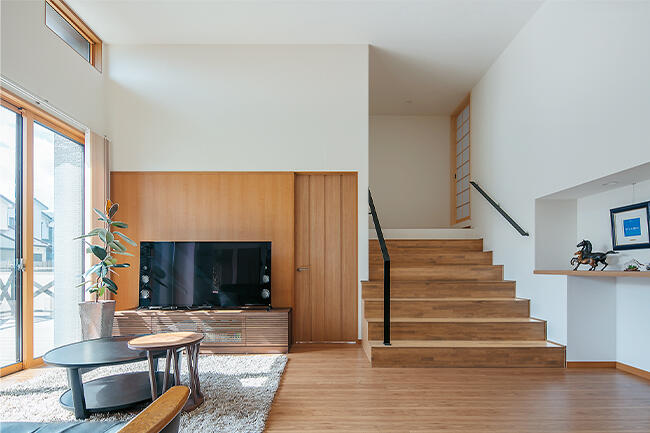 「以前の住まいは寒くて、収納が少なく、駐車スペースも足りなかったんです」と語るご夫妻。そこでゆとりある敷地に、広い外構と大屋根を施した明るいお住まいを新築しました。室内は開放感あふれる大開口や高天井、リビング内のベンチ階段、大収納空間「蔵」など、「ぜひ欲しかった」という希望を叶えつつ、将来は二世帯住宅として利用できるよう配慮されています。