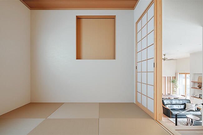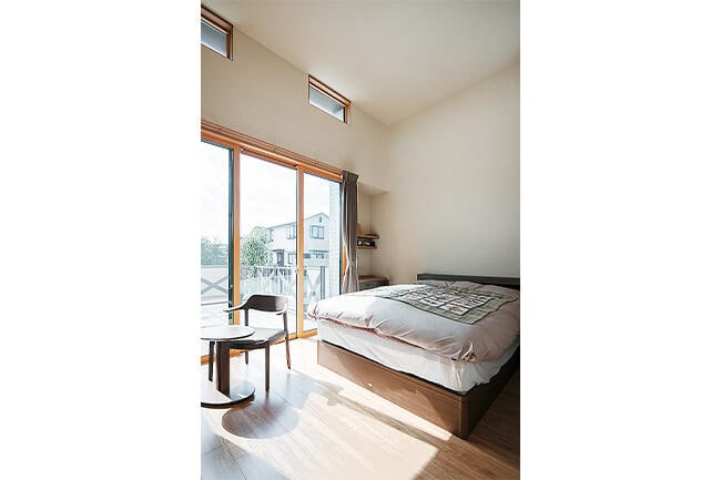 庭に面した1階の大開口の先には、ご主人のこだわりでもあるウッドデッキが施され、室内空間にさらなる広がりを与えています。また、主寝室のウォークインクロゼットには外へ抜けられる「蔵」を併設。その蔵上を和室とし、リビング側に幅広のベンチ階段を設けました。
