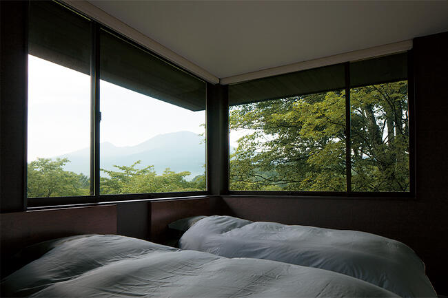 森の木々の頭を抜けた爽快なビューを堪能できる2階ゲストルーム。遠景には浅間山を望むことができます