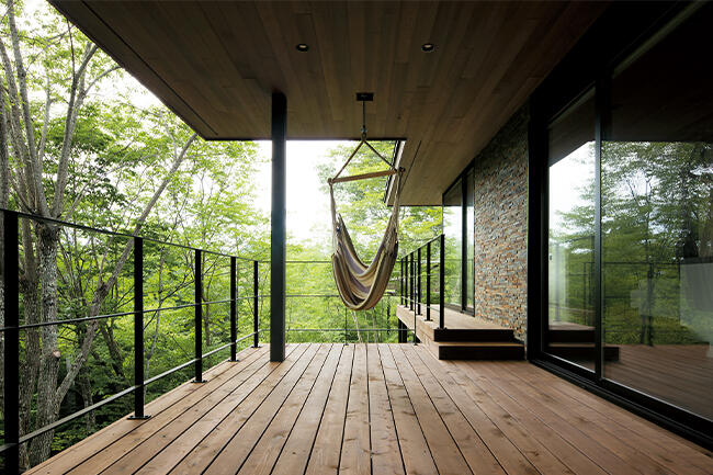 ゆったりと森林浴ができるテラス。Kさまのご要望により、愛用のハンモックを取り付けるフックを設置しました