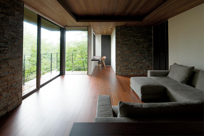 大きな開口から自然を取り込むリビング。奥に続くライブラリー、寝室でも同じ風景を楽しめます