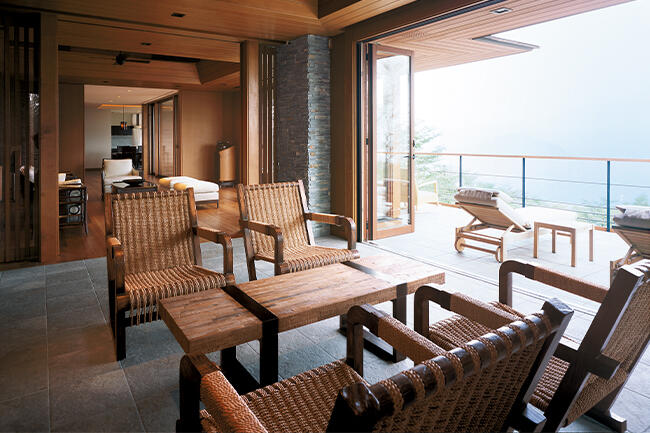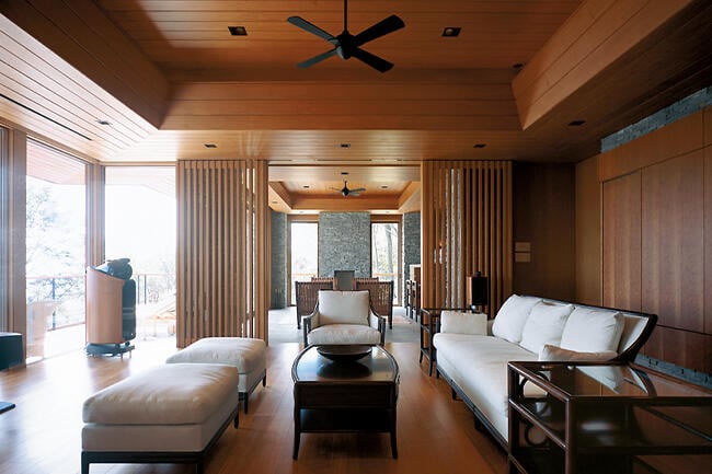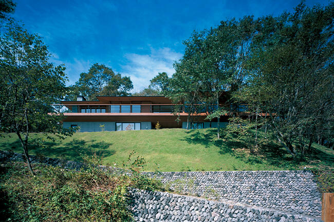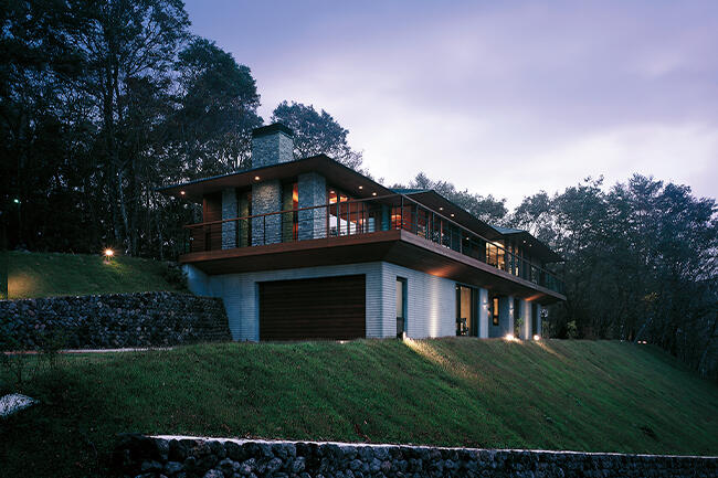 「海外の滞在型高級リゾートの雰囲気を取り入れたい」というOさまのご要望をお聞きしながら、自然素材を用いて軽井沢の風景や歴史に調和するモダンなデザインを実現。プラン作成前に1年以上もミーティングを重ねただけに「フランク・ロイド・ライトが好きで建築家志望だった」というOさまにたいへんご満足いただいています。