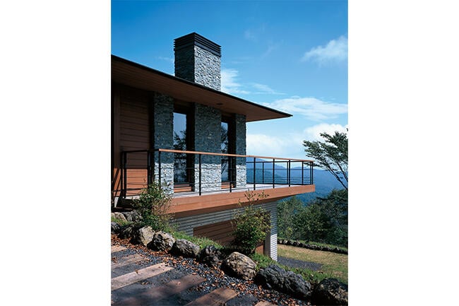 軽井沢の豊かな自然を見晴らせるバルコニー。深い庇が印象的