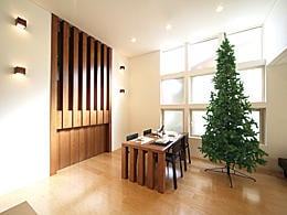 格子は、空間の広さや高さを考慮した独自の間隔でつくられたオリジナル。格子による「見え隠れ」が空間を程よく仕切り、適度な一体感を生み出しています。同じ格子がダイニングテーブルの脚やキツチンの仕切りなどにも使われ、視覚効果だけではなく、空間のデザイン的なアクセントになっています。