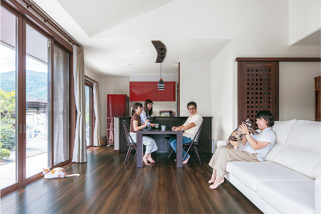 「30℃の省エネ設定で十分快適でした。リビングとダイニングには床暖房を設置したので、冬も足下からぽかぽか暖まり、愛猫たちも気持ちよさそうです」と笑顔が広がりました。