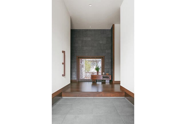 玄関ホールに入ると、正面の大きな地窓から中庭の景色が切り取った絵のように目に入ります。季節の花が飾られた古木の台は、以前の大黒柱を再利用したものだそう。