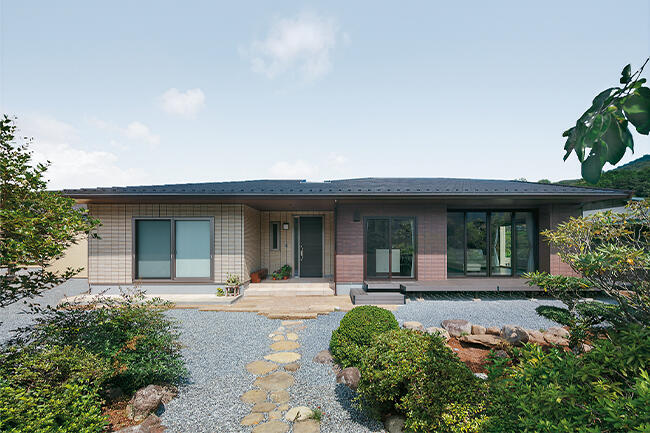 山々に囲まれた自然豊かな地に、和風庭園を抱いてたたずむKさま邸。築120年の生家を、大屋根が風格を漂わせる平屋のお住まいに建て替えられました。 「生家はご先祖から引き継いだ思い出深い建物でしたので、外観のシルエットを踏襲し、愛着のある古材も空間づくりに上手に生かしてもらいました」とKさまは語ります。