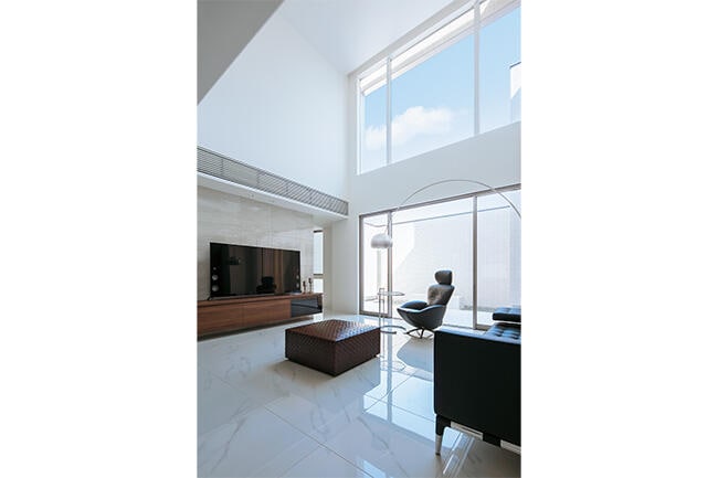 LDKは約30畳の大空間で、6mを超える吹き抜けリビングは、上の窓からも光が差し込んで圧巻の明るさです。白い大理石調フロアに黒革ソファやアールを描くアルコランプが調和する上質な空間は、ラグジュアリーホテルさながら。