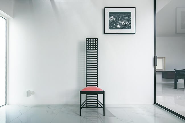 玄関から続く階段ホールの壁際には、マッキントッシュの名作椅子、ラダーバックチェアを飾ってインテリアのアクセントに。ブラウンガラスの壁越しにリビングが透けて見える演出も素敵です。