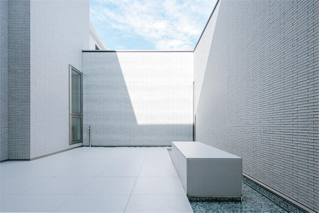 モザイクタイルの水盤にたたえられた水が陽光を受けてゆらめき、モダンアートの美術館のよう。この中庭はリビングにも面しており、高い壁で外からの視線を遮ることで、プライバシーが守られています。 「家にいながら非日常的な雰囲気が味わえる暮らしがしたくて、ハワイのお気に入りホテルのテイストを設計に取り入れてもらいました」とOさまは語ります。