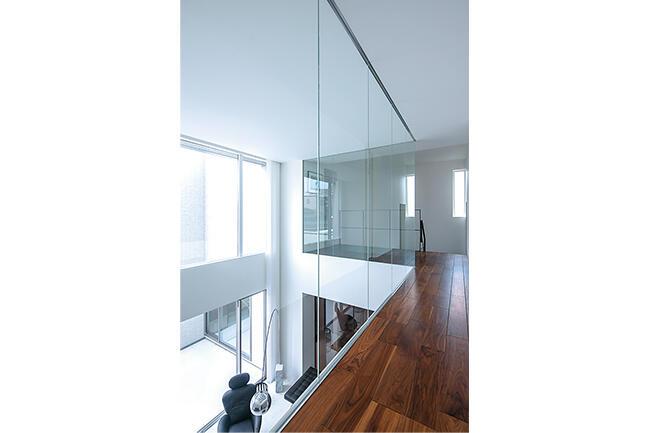 Oさま邸の玄関ホールに入ると、そこに広がるのは虚飾を排し、ラインで建築美を際立たせた白の世界。大きな窓越しに見えるホワイトタイルの中庭に目が奪われます。
