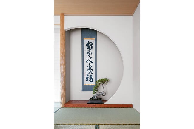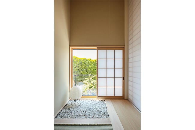 玄関ホールの続きに設けた和室は、室内に白砂利の坪庭をしつらえた粋な演出で、障子を開けると外の坪庭も見えて、客人の目を楽しませます。