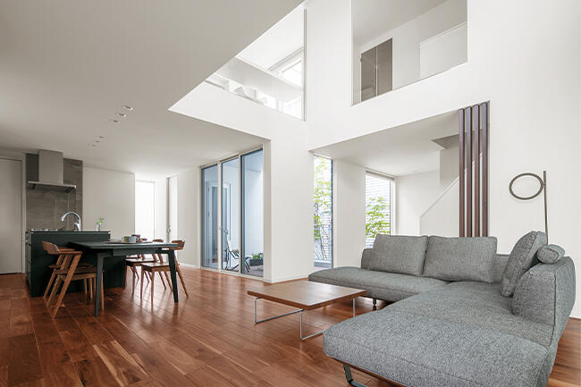 どこにいても中庭のシンボルツリーが眺められる3階建てのお住まいで、四季の変化を愛でる情趣豊かな暮らしを満喫されているAさま。 中庭をコの字に囲んだプランで、道路側からの視線をルーバーで遮ってプライバシーを守り、カーテンいらずの明るく開放的な住空間を実現しています。