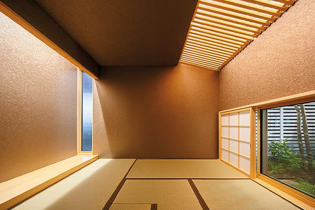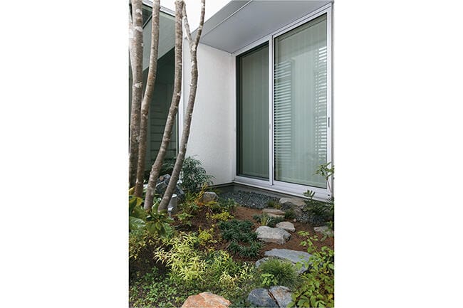 1階には茶事をたしなむ奥さまのために、水屋をしつらえた本格的な茶室が設けられ、ここの地窓から見える中庭は飛び石や下草で和風の趣に演出されています。