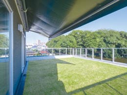 そしてご主人の書斎が3階にあり、趣味や調べものをするなど、のんびり過ごすスペースとなっています。広いテラスには天然芝が敷き詰められ、ここでも窓の外にグリーンが広がります。