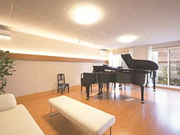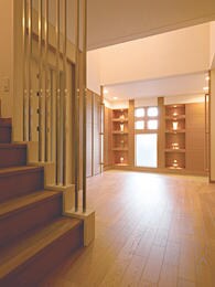 Oさまご夫妻がこだわったのは、「多くの人が集まって楽しめること」「収納がたくさんあること」、そして「自然を感じることができること」でした。以前、音大でピアノの講師をしていた奥さま。今も自宅で教えているため、1階には2台のグランドピアノが置けるレッスン室があります。ここにはミニキッチンや歓談できるコーナーも設置され、ミニコンサートやパーティをすることもしばしば。