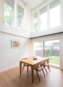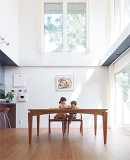ご主人が強く希望したのが、「星が見えること」でした。夕食やその後のくつろぎの時間に、窓から星を眺められたら、どんなに心が和むだろうと思っていたからです。また、奥さまは家族がもっとも時間を費やすのはダイニング。できれば、このダイニングを広く充実したものにしたいとのご希望でした。そこで実現したのが、高い吹き抜けとたくさんの開口部を設け、椅子に座ったときにちょうど星空の見えるダイニングです。キッチンにはカウンターも設置され、夜間、照明を落とせばショットバーのような雰囲気に。ダイニングが日常の食卓としてだけでなく、リラックスのための空間になっています。