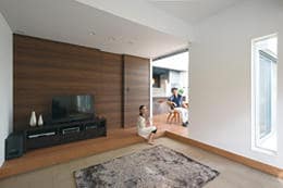 また、隣接するリビングは一段低くなっているため、ダイニングと一体感がありつつも、独立した空間として過ごすことが可能。玄関に面した壁には扉が設けられ、扉の開閉次第でリビングが開放的になったり、個室のように使用できたり、さまざまな表情を楽しむことができます。