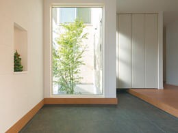 そして玄関扉を開けると、正面の大きな窓にモミジが映り込み、まるで絵画のよう。ここも、ご夫妻のこだわりの一つです。
