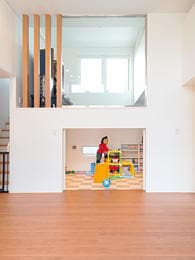 Eさま邸の1階は、リビング、ダイニング、キッチンが一体となったパブリックスペース。リビング横の「蔵」は、現在はお子さまの遊具の収納場所としても大活躍。蔵上は、畳敷きのマルチスペースで、大きなガラス窓から1階を見渡すことができます。