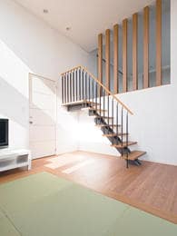 2階には、ご夫妻の主室とお子さまの部屋があり、ユニークなのが主室です。ここは1階の蔵の高さを活かして、2階部分を畳敷きのリラックススペースに、2.5階部分を寝室にしたメゾネット式。さらに、Eさま邸にはゲストルームもあり、居室側の玄関ホールから廊下でつながっています。
