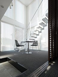 印象的なのは、ゲストルーム側の玄関。吹き抜けのホールは大きなガラス窓に囲まれ、シンプルにデザインされた階段もあって、まるで小さなホテルのよう。また、居住スペースとゲストルームの間にも庭があり、両側から四季を楽しめる仕掛けとなっています。